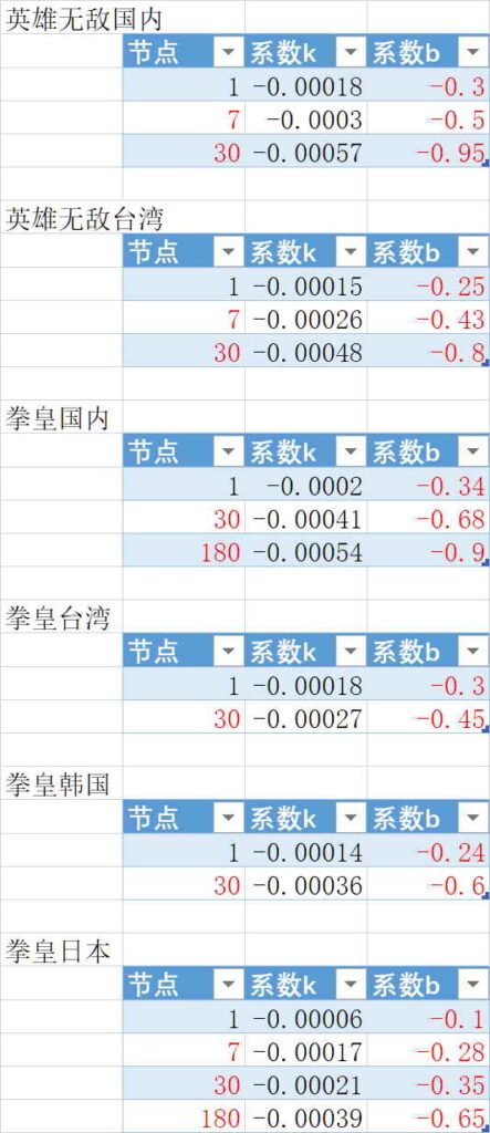 这里以留存为例举个例子,拳皇是一款强竞争游戏,但是设计思路却在尽量照顾大小R差距,在30日开始,留存系数出现衰减改变。